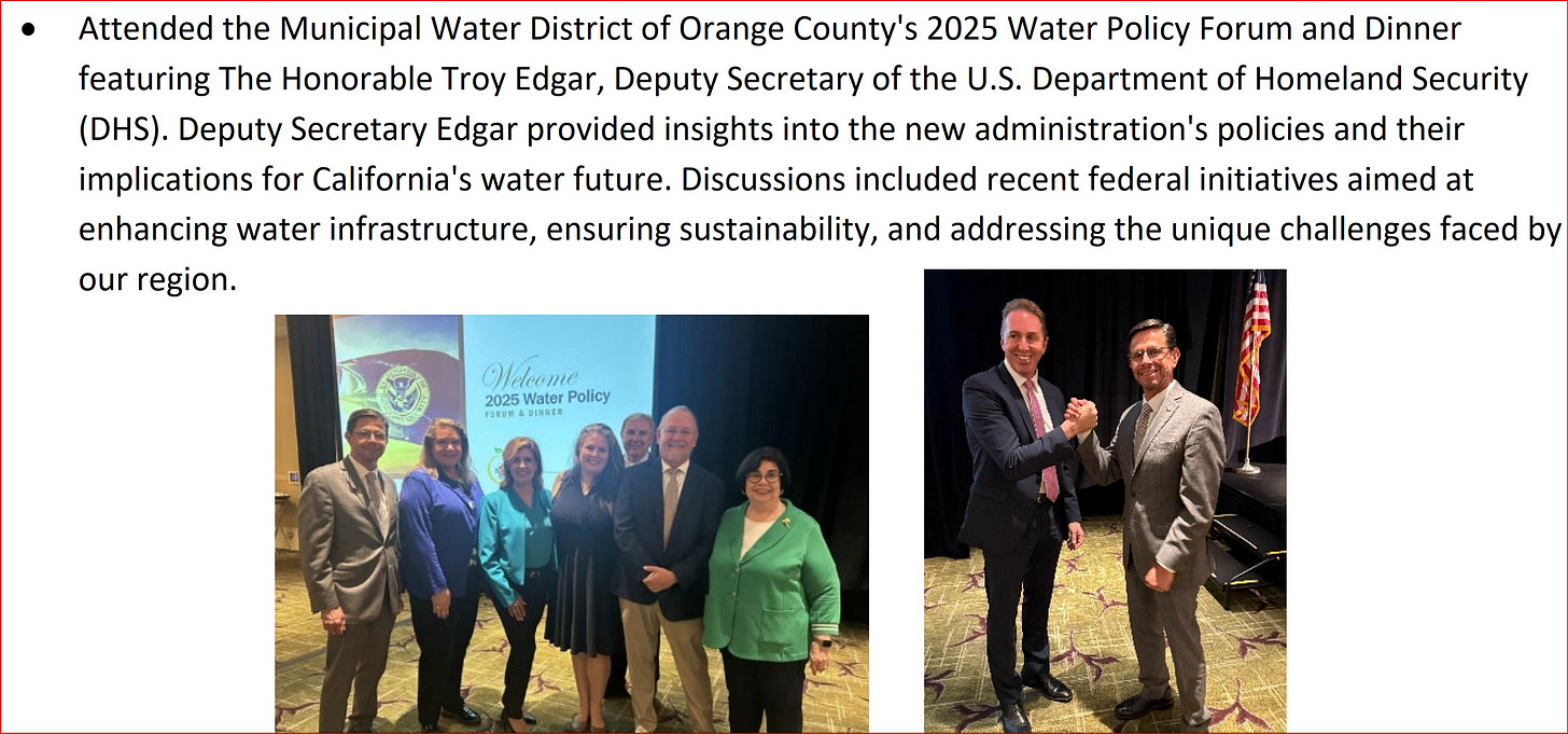 On June 26, the Municipal Water District of Orange County (MWDOC) held its corporate‑sponsored Water Policy Forum & Dinner in Costa Mesa. The honored keynote speaker was Troy Edgar, Deputy Secretary of the Department of homeland Security—the agency responsible for ICE, FEMA, and other national‑security and disaster‑response functions. By that date, the DHS/Trump administration’s anti‑immigrant policies, its hostility toward D.E.I., its politicization of federal funding, its cuts to FEMA, its removal of climate‑change planning from federal policy, and its increasingly aggressive, brutal and legally questionable ICE enforcement practices were all well documented. DHS had also launched a recruitment campaign (July 2025) using imagery and slogans widely criticized as racist and authoritarian (or Neo-fascist). These policies have continued, most recently underscored by the killing of a Minneapolis resident by an ICE agent.