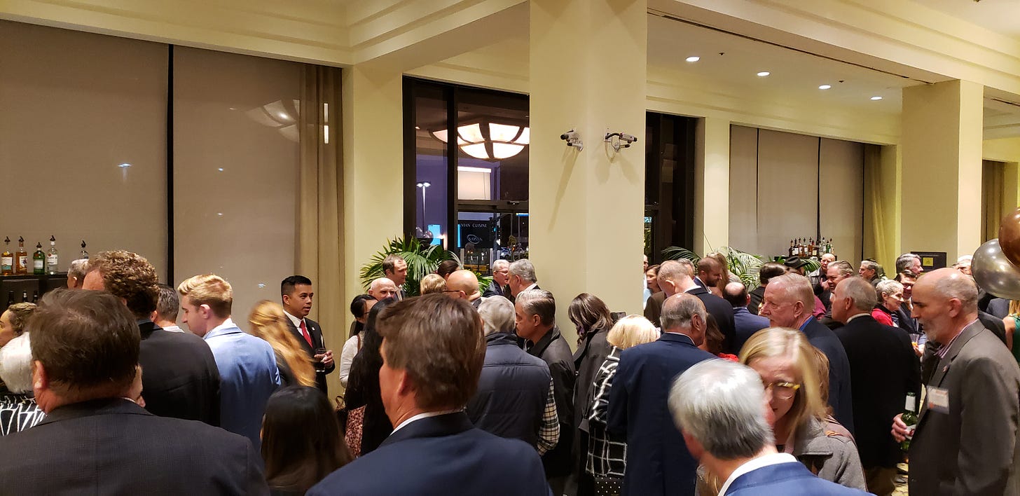 A few notes about these gatherings. They’re always held in the ballroom of an upscale hotel. Before dinner, you can buy a drink at the bar just outside the doors, giving you a chance to mingle with the Who’s Who of Southern California water buffalos and maybe overhear a few interesting conversations not meant for public ears.